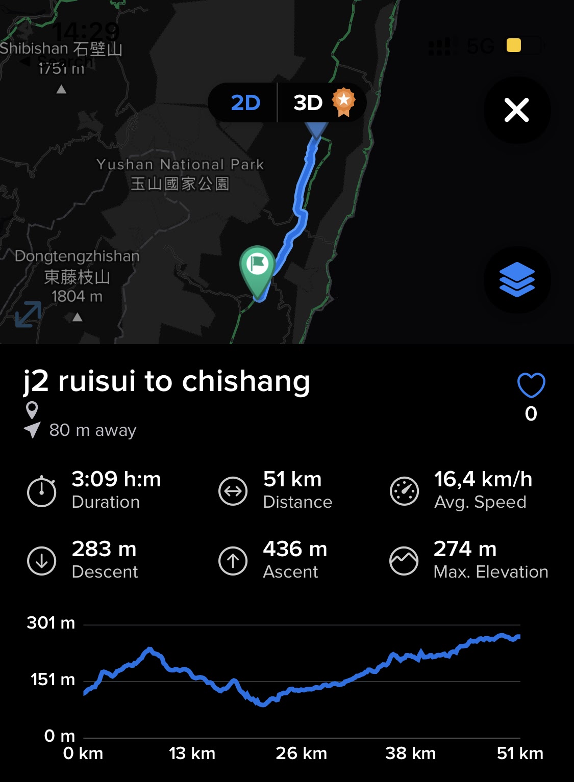 A few kilometers after starting, I could definitely feel I was climbing, and I wasn’t prepared for it. I wouldn’t call this a mountain road, but the first eight kilometers outside of Ruisui are definitely challenging, even if some tech company labelled this section as “mostly flat”. I kept going and made it past the park, located at the very top of this hill.