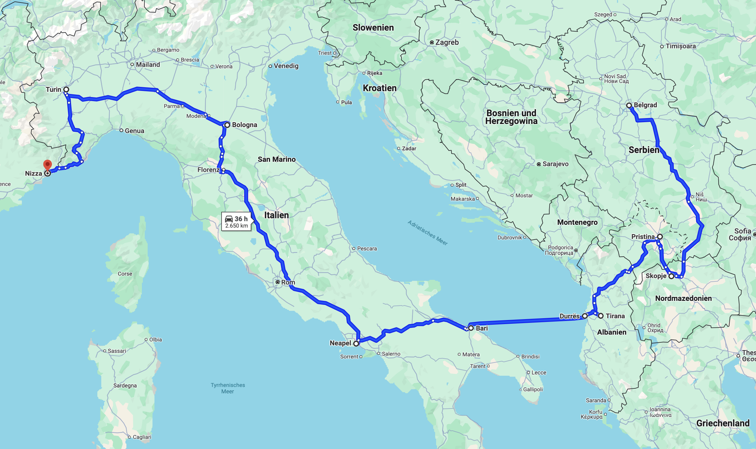 My trip was a very fun one. I started in Belgrade, and stopped in Pristina, Skopje, Tirana, Durrës, Bari, Naples, Bologna, and Turin to come and see you in Nice. I spent a month backpacking on my own, moving around in buses and trains, and stopping for coffee to look around streets and plazas I had never seen before. I’ve had the opportunity to see a lot of different places, hear a lot of stories, and eat a lot of good food in a very short time.